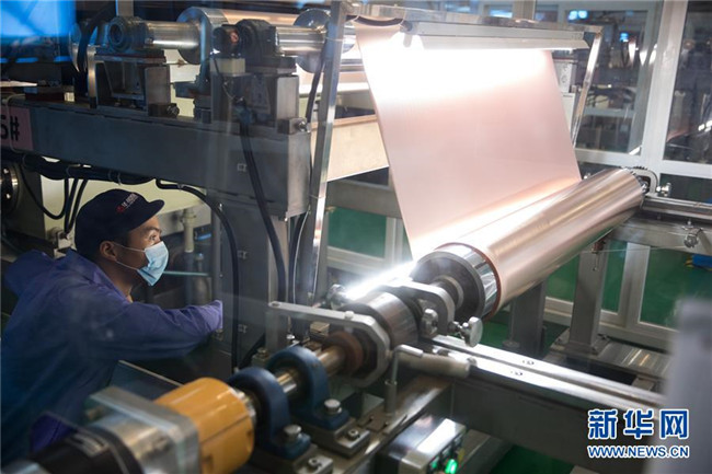 在安徽省銅陵市華創(chuàng)新材料有限公司生產(chǎn)車間,一名員工在監(jiān)測(cè)鋰電銅箔生產(chǎn)過(guò)程(2018年8月8日攝)。新華社記者 金立旺 攝