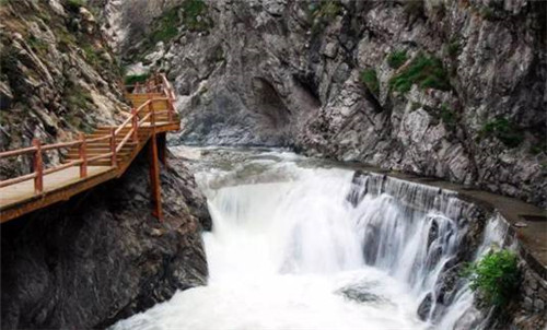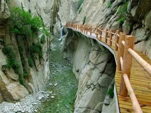 第二游:仙峪(仙峪,又名車箱谷,在華山峪西,與華山峪僅一嶺之隔,傳說古時黃初平、黃初起弟兄在此牧羊成仙,因而得名。仙峪深五十余里,峪道窄狹清幽,山路崎嶇蜿蜒,河流湍急,山石險峻,多處路段鑿崖,加棧凌空通過。進峪五里處,有斜嶺橫阻,令人有谷盡路絕之感,然越嶺橫度,又平添柳暗花明的情趣)。