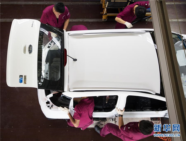 2018年8月7日,工人在安徽江淮汽車集團(tuán)股份有限公司安慶分公司新能源汽車總裝生產(chǎn)線上安裝純電動車。 新華社記者 金立旺 攝