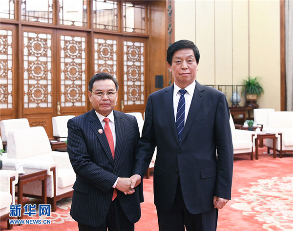 全國(guó)人大常委會(huì)委員長(zhǎng)栗戰(zhàn)書(shū)19日在人民大會(huì)堂會(huì)見(jiàn)老撾建國(guó)陣線中央主席賽頌蓬。