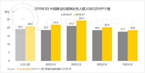 移動(dòng)大數(shù)據(jù)平臺(tái)QuestMobile發(fā)布最新“她經(jīng)濟(jì)”洞察報(bào)告顯示,截至2019年1月,女性用戶人均打開APP個(gè)數(shù)達(dá)21個(gè),高于移動(dòng)互聯(lián)網(wǎng)的平均水平,主要為短視頻、綜合電商、社交等三類。