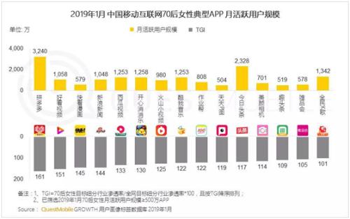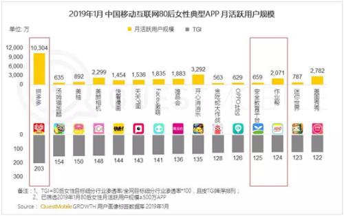 在拼多多、今日頭條、新浪微博、美顏相機(jī)及各類短視頻等女性最愛打開的20多個(gè)APP中,移動(dòng)互聯(lián)網(wǎng)70和80后女性最愛使用的典型APP是新電商平臺(tái)拼多多,達(dá)到3240萬(wàn),TGI(Target Group Index,目標(biāo)群體指數(shù))高達(dá)80.5%,超過(guò)各類短視頻應(yīng)用。