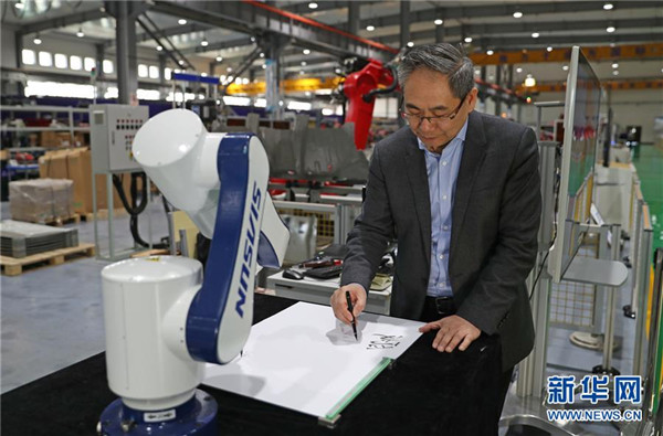 3月29日,沈陽新松機器人自動化股份有限公司創(chuàng)始人兼總裁曲道奎和公司生產(chǎn)的機器人共同書寫“愛國奮斗”字樣。 新華社記者 楊青 攝