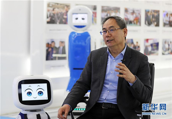 3月29日,沈陽新松機器人自動化股份有限公司創(chuàng)始人兼總裁曲道奎和公司生產(chǎn)的機器人互動。 新華社記者 楊青 攝