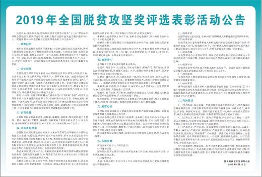 經(jīng)黨中央、國務(wù)院批準,國務(wù)院扶貧開發(fā)領(lǐng)導(dǎo)小組在“十三五”期間每年開展全國脫貧攻堅獎評選活動,表彰為脫貧攻堅作出突出貢獻的組織和個人?,F(xiàn)就開展2019年全國脫貧攻堅獎評選表彰工作公告如下。