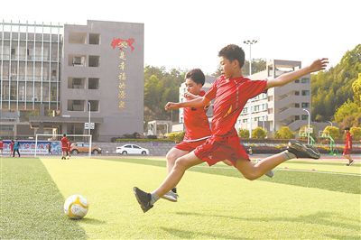 日前,湖北省武漢市英山縣思源實(shí)驗(yàn)學(xué)校綠茵操場上,學(xué)生正在進(jìn)行攔截?fù)屒蛴?xùn)練。為了培養(yǎng)學(xué)生的足球興趣,該校開展了“陽光足球大課間”體育活動(dòng),倡導(dǎo)全體師生充分享受課間足球運(yùn)動(dòng)。(單藝偉/攝)