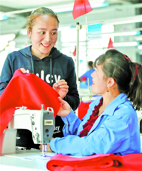 4月19日,亞爾買里村村民阿瓦汗·艾尼瓦爾(左)在車間與工人交流。如今,她已成長(zhǎng)為村辦工廠的廠長(zhǎng)助理。周鵬 攝