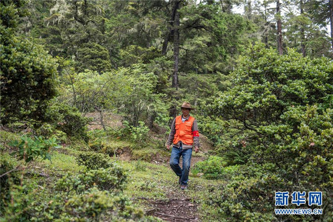 護(hù)林員孫諾在普達(dá)措國(guó)家公園里巡山護(hù)林(2018年7月18日攝)。新華社記者 胡超 攝