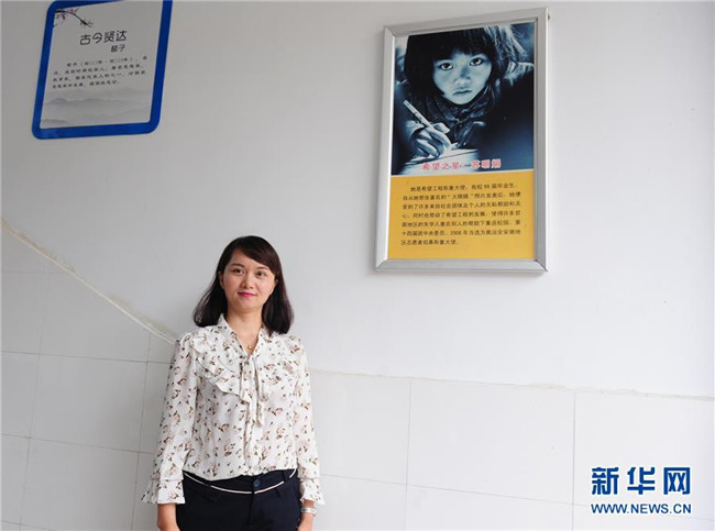 2018年5月29日,在安徽金寨三合實驗學校,蘇明娟與當年的宣傳照片合影。新華社發(fā)(王從啟 攝)