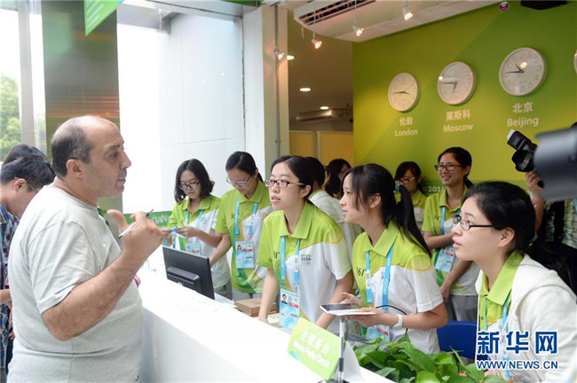2014年8月14日, 2014南京青奧會志愿者在主媒體中心回答一名外國記者的咨詢。新華社記者陳曄華攝