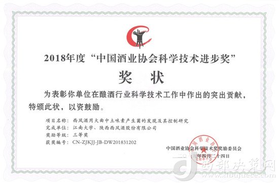 近日,中國(guó)酒業(yè)協(xié)會(huì)第五屆理事會(huì)擴(kuò)大會(huì)議在北京隆重舉行,大會(huì)突出表彰了在釀酒產(chǎn)業(yè)科技發(fā)明、技術(shù)推廣、科技成果轉(zhuǎn)化等方面取得了杰出業(yè)績(jī)和重要貢獻(xiàn)的領(lǐng)軍人才和優(yōu)秀專家,表彰了2018年度“中國(guó)酒業(yè)協(xié)會(huì)科學(xué)技術(shù)獎(jiǎng)”獲獎(jiǎng)項(xiàng)目和論文的完成單位及個(gè)人,并頒發(fā)證書及獎(jiǎng)金。西鳳集團(tuán)公司《西鳳酒用大曲中土味素產(chǎn)生菌的發(fā)現(xiàn)及其控制研究》項(xiàng)目榮獲中國(guó)酒業(yè)協(xié)會(huì)科學(xué)技術(shù)進(jìn)步獎(jiǎng)三等獎(jiǎng)。受到了大會(huì)表彰。