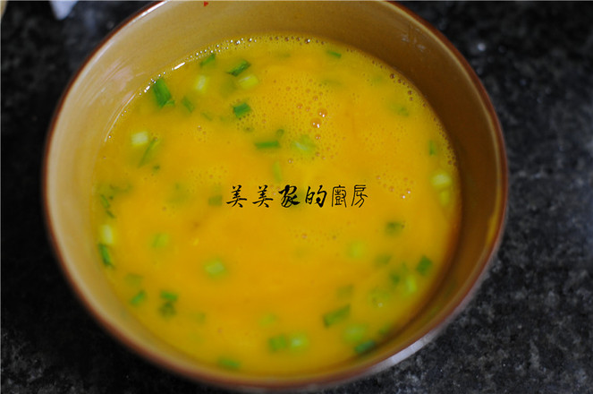4.雞蛋打散,加入鹽和蔥花,充分打散拌勻。