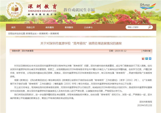 《通報(bào)》稱,針對(duì)近日媒體和社會(huì)關(guān)注的深圳市富源學(xué)校部分高考學(xué)生涉嫌“高考移民”問題,深圳市委市政府高度重視,成立專門調(diào)查組進(jìn)行了深入調(diào)查。經(jīng)約談深圳市富源學(xué)校舉辦者及學(xué)校管理層、教職工,實(shí)地調(diào)查該校2019年高考報(bào)名學(xué)生中戶籍從外省遷入廣東省考生的學(xué)籍檔案、在校學(xué)習(xí)記錄、戶籍遷移手續(xù)、轉(zhuǎn)學(xué)手續(xù)、父母在我市繳納社保記錄等,現(xiàn)查實(shí),深圳市富源學(xué)校2019年高考報(bào)名考生中,有32名考生屬“高考移民”,弄虛作假獲取廣東省報(bào)考資格。