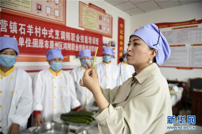 培訓(xùn)老師在中式烹調(diào)師職業(yè)技能培訓(xùn)班上為寧夏固原市原州區(qū)頭營(yíng)鎮(zhèn)石羊村婦女講解食材選用規(guī)范(5月14日攝)。 新華社發(fā)(馮開華 攝)