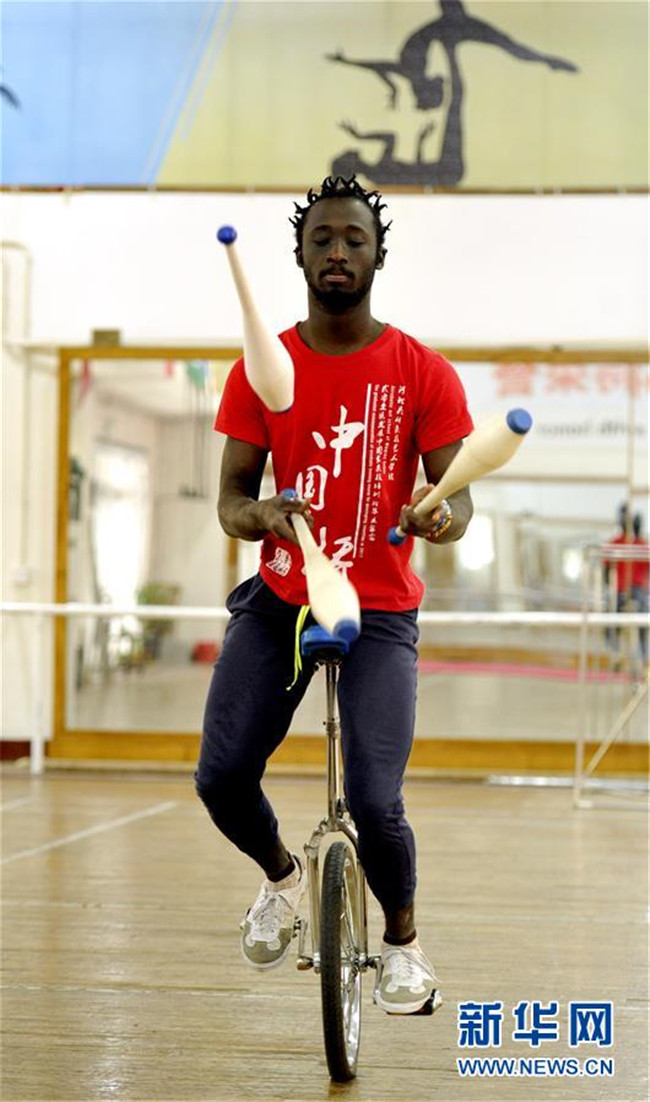 5月20日,在吳橋雜技藝術(shù)學校,留學生練習雜技。 新華社發(fā)(苑立偉 攝)