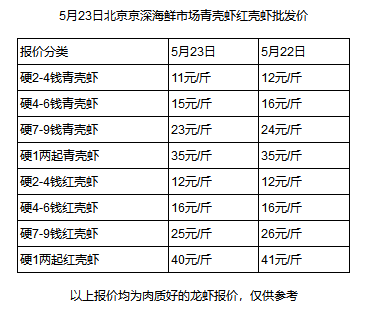 水產養(yǎng)殖網今早上傳的5月23日北京京深海鮮市場紅殼蝦青殼蝦批發(fā)價顯示,個頭最?。?-4錢/只)、最便宜的小龍蝦批發(fā)價僅需11元/斤,比昨天又降了1元。而湖南、江蘇、廣東等地的價格也和北京差不多,武漢甚至低至9元/斤。