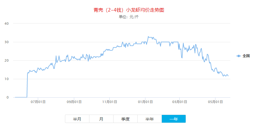 小龍蝦價格網上發(fā)布的全國小龍蝦批發(fā)價走勢圖也顯示,近日價格為一年中的低點,均價在11元上下。
