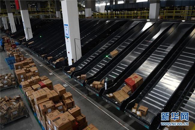 在浙江嘉興菜鳥“未來園區(qū)”,商品按照包裹地址的不同進(jìn)行自動分撥(3月27日攝)。新華社記者 黃宗治 攝