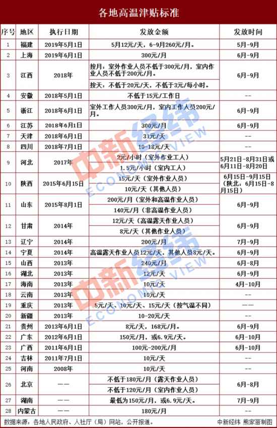 中新經(jīng)緯客戶端注意到,截至2019年5月23日,部分地區(qū)的高溫津貼實(shí)施辦法已超過(guò)有效期,這些省份或可能對(duì)高溫津貼標(biāo)準(zhǔn)進(jìn)行調(diào)整。