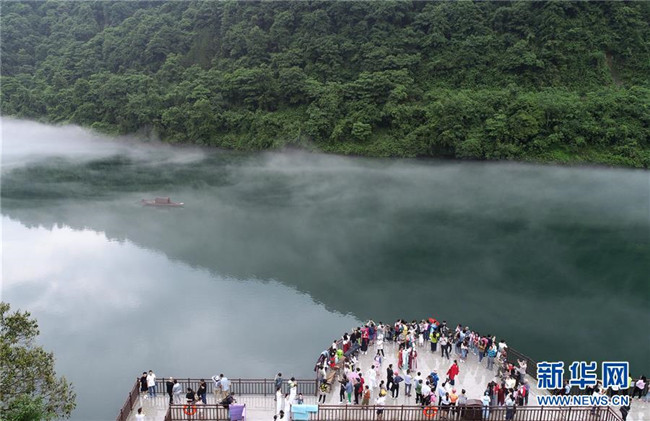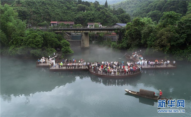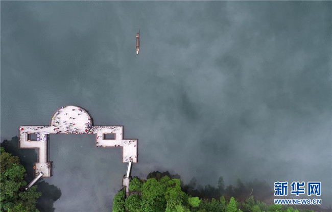 5月25日清晨,一艘小船劃過小東江江面,吸引游人駐足(無(wú)人機(jī)拍攝)。新華社發(fā)(朱孝榮 攝)
