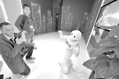 5月26日,參觀者在2019中國國際大數(shù)據(jù)產(chǎn)業(yè)博覽會(huì)上與5G+智能機(jī)器人進(jìn)行拍照互動(dòng)。記者 楊文斌 攝