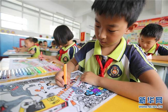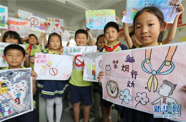 5月30日,臨沂市沂南縣第五實驗小學的學生在繪制無煙日手抄報。新華社發(fā)(王彥冰 攝)