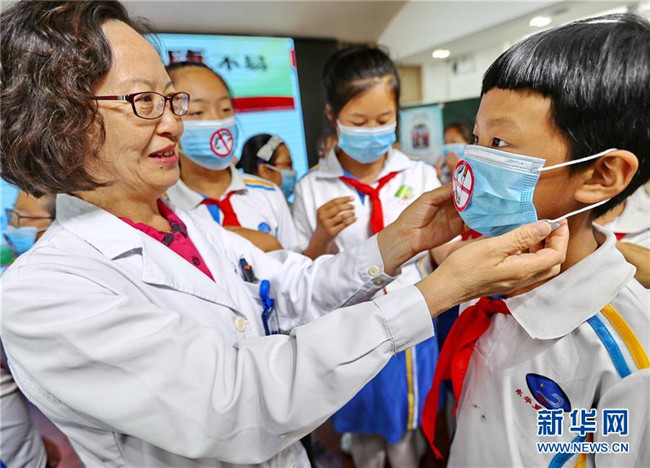 5月30日,秦皇島市第一醫(yī)院醫(yī)務工作者為東華里小學學生佩戴禁煙標識口罩。新華社發(fā)(曹建雄 攝)
