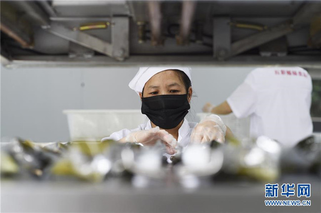 6月2日,在臺(tái)江縣一家食品生產(chǎn)企業(yè)車間,工人將煮熟的五彩粽進(jìn)行真空包裝?!⌒氯A社發(fā)(劉開福 攝)