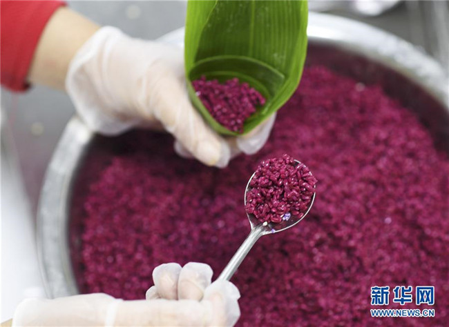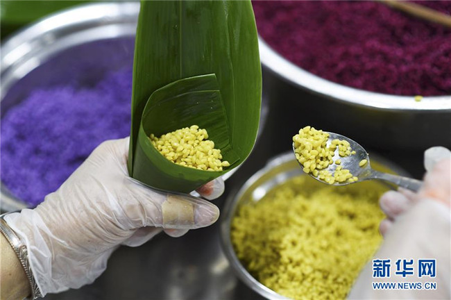 6月2日,在臺(tái)江縣一家食品生產(chǎn)企業(yè)車間,工人在包制五彩粽?!⌒氯A社發(fā)(劉開福 攝)