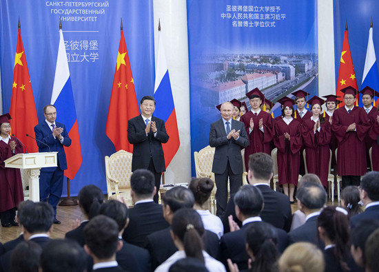 當?shù)貢r間6月6日,又一場特殊儀式在圣彼得堡國立大學(xué)舉行。習(xí)近平被授予圣彼得堡國立大學(xué)名譽博士學(xué)位。他在答辭中說道,這既是雙方教育和人文領(lǐng)域密切交流的例證,更是中俄關(guān)系高水平的重要體現(xiàn)。他同時希望雙方不斷擴大教育領(lǐng)域交流合作。