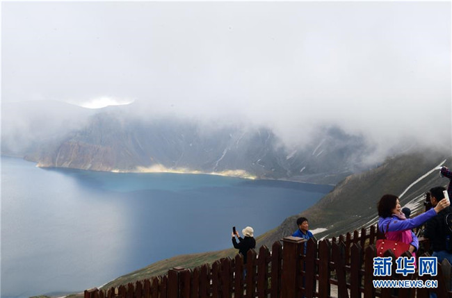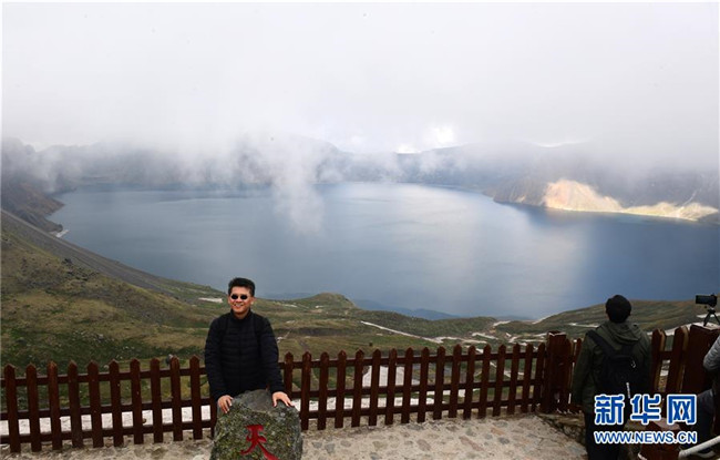 游客在長白山天池游覽拍照(6月14日攝)。