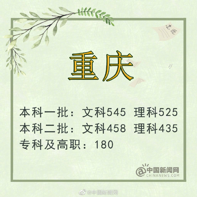 23日,重慶市公布2019年全國普通高校各類招生錄取最低控制分數(shù)線。第一批本科文史類545分、理工類525分;第二批本科文史類458分、理工類435分;文高職專科批:180分。