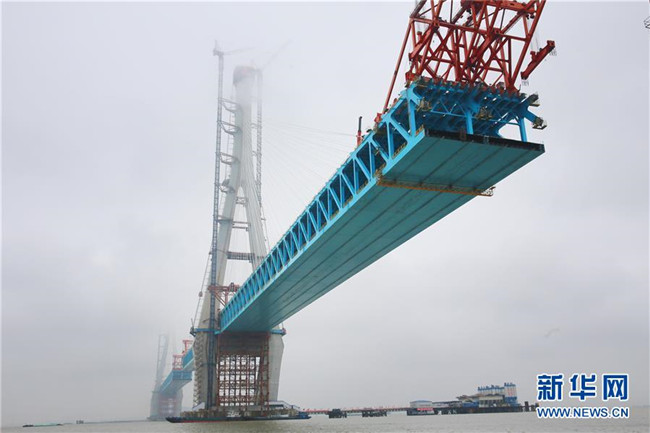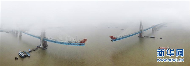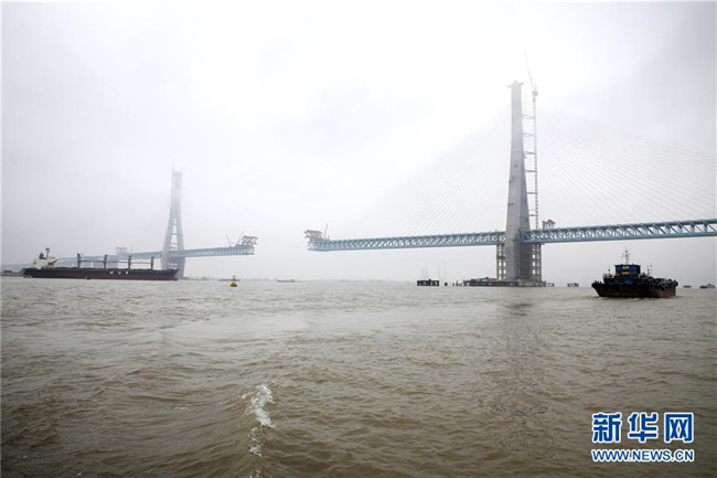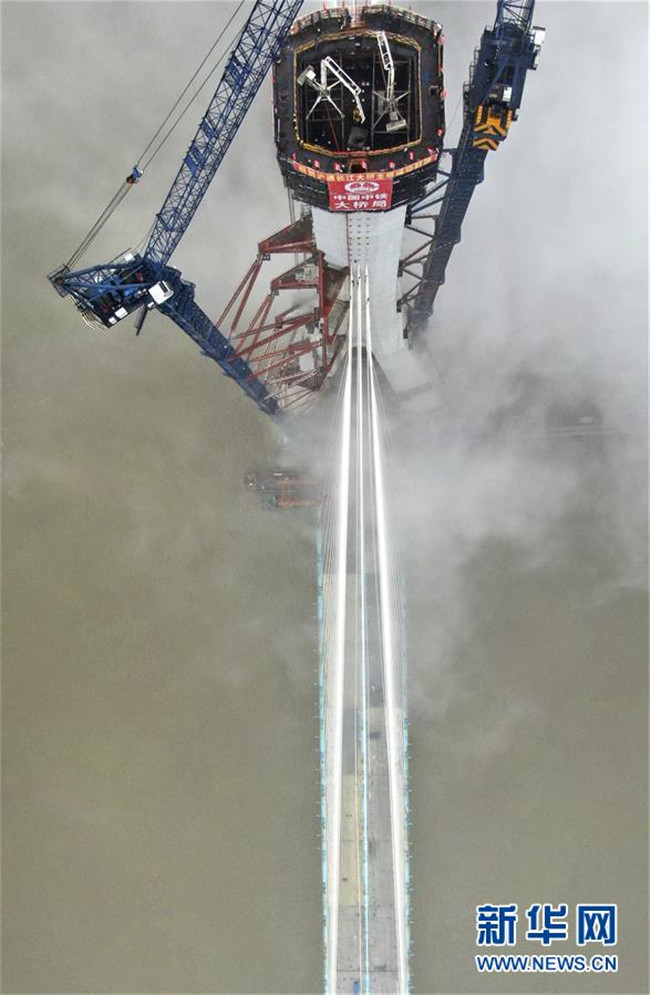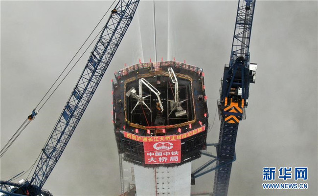 當日,滬通長江大橋南主塔順利封頂。至此,該橋兩座高達330米的主塔全部建成,標志著世界最大跨度公鐵兩用斜拉橋建設取得了關鍵性進展。滬通長江大橋全長11072米,主橋長2296米,主跨1092米,是滬通鐵路全線的控制性工程,設計為上層6車道高速公路,下層4線鐵路。新華社發(fā)(許叢軍攝)