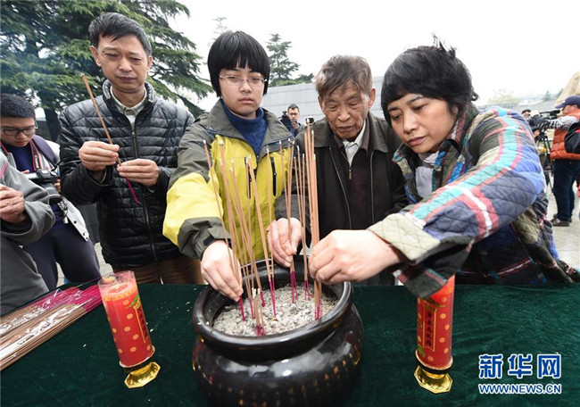 南京大屠殺幸存者常志強(右二)率親屬在侵華日軍南京大屠殺遇難同胞紀(jì)念館內(nèi)的遇難者名單墻前焚香(2015年4月5日攝)。新華社記者孫參攝