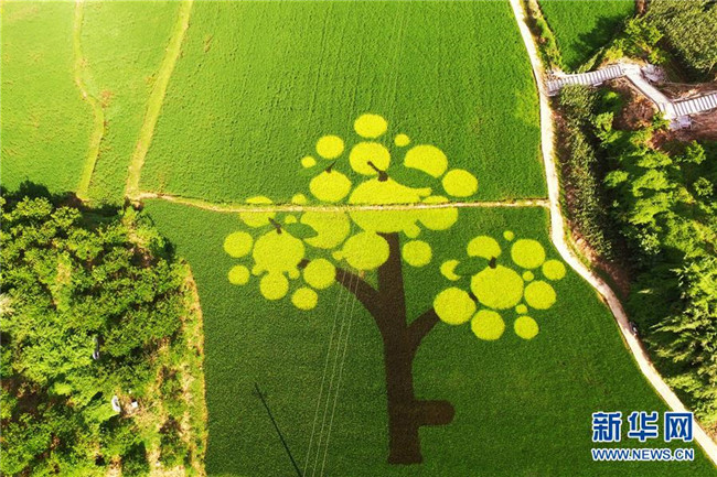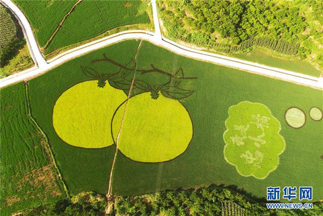 仲夏時節(jié),在重慶忠縣新立鎮(zhèn)中嶺社區(qū)出現水稻拼成的“笑臉”“橘子”等圖案,成為一道靚麗的鄉(xiāng)村田園風景線。新華社記者 王全超 攝