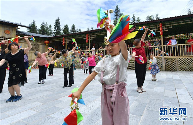 7月1日,游客在湖北省恩施土家族苗族自治州宣恩縣珠山鎮(zhèn)車(chē)洞坪民宿旅游區(qū)體驗(yàn)土家族“八寶銅鈴舞”。 新華社發(fā)(宋文 攝)