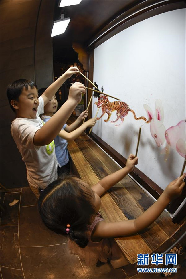 6月30日,小朋友在河北唐山一家博物館體驗(yàn)灤州皮影。新華社發(fā)(劉滿(mǎn)倉(cāng) 攝)