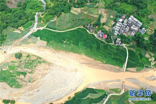 廣西河池市東蘭縣隘洞鎮(zhèn)坡拉村高更屯兩條通屯道路均被洪水沖毀(7月16日無(wú)人機(jī)拍攝)。