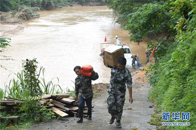 7月16日,廣西河池市東蘭縣隘洞鎮(zhèn)民兵應(yīng)急分隊(duì)隊(duì)員將救災(zāi)物資從船上扛到岸上。