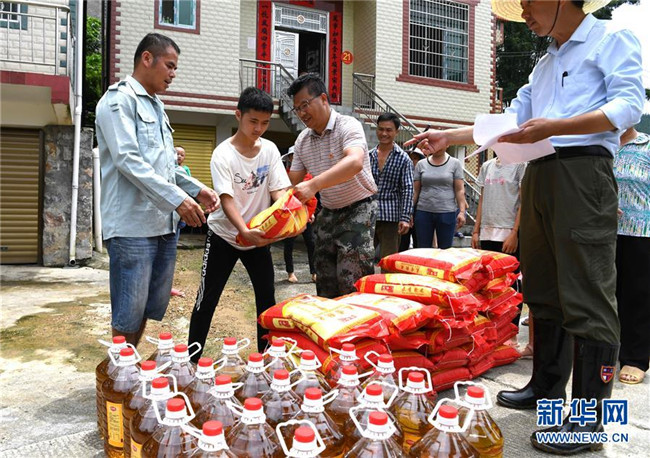 7月16日,廣西河池市東蘭縣隘洞鎮(zhèn)坡拉村高更屯村民在領(lǐng)取救災(zāi)物資。