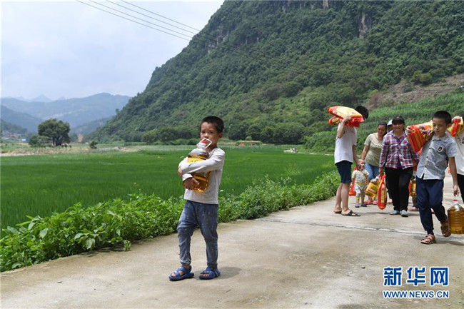 7月16日,廣西河池市東蘭縣隘洞鎮(zhèn)坡拉村高更屯村民拿著剛剛領(lǐng)取的救災(zāi)物資回家。