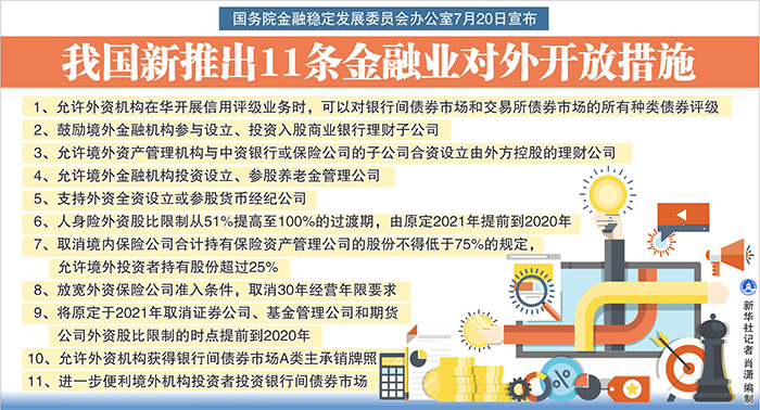 國務院金融穩(wěn)定發(fā)展委員會辦公室20日對外宣布,為貫徹落實黨中央、國務院關于進一步擴大對外開放的決策部署,按照“宜快不宜慢、宜早不宜遲”的原則,在深入研究評估的基礎上,推出以下11條金融業(yè)對外開放措施: