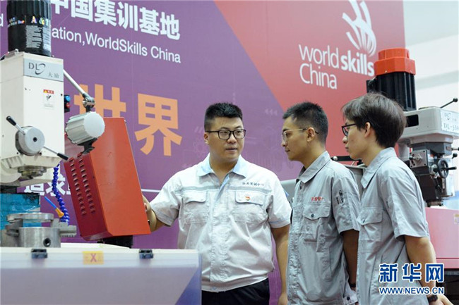 中國(天津)職業(yè)技能公共實(shí)訓(xùn)中心現(xiàn)代制造技術(shù)教研室主任王傳龍?jiān)谥笇?dǎo)學(xué)員實(shí)訓(xùn) (7月29日攝)。 新華社發(fā)