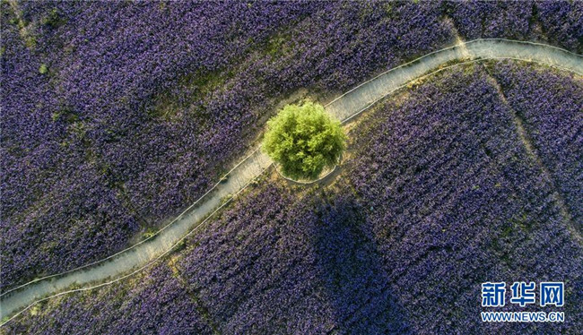 寧夏艾伊薰衣草生態(tài)基地內(nèi)大片馬鞭草競相開放(8月17日無人機拍攝)。