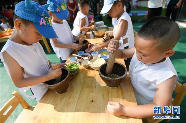 8月20日,贛州市贛縣區(qū)城關(guān)幼兒園的孩子們在體驗(yàn)制作擂茶。