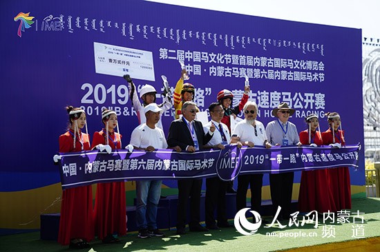 人民網(wǎng)呼和浩特8月21日電(富麗娟 實習(xí)生 李娜)8月21日上午,作為第二屆中國馬文化節(jié)暨首屆內(nèi)蒙古國際馬文化博覽會的重要活動之一的2019“一帶一路”內(nèi)蒙古速度馬公開賽,在內(nèi)蒙古少數(shù)民族群眾文化體育運動中心開賽。比賽分為3場,共22對人馬組合參賽,爭奪國產(chǎn)純血馬1200米、成年馬組2750米和3歲馬組2000米比賽的桂冠。