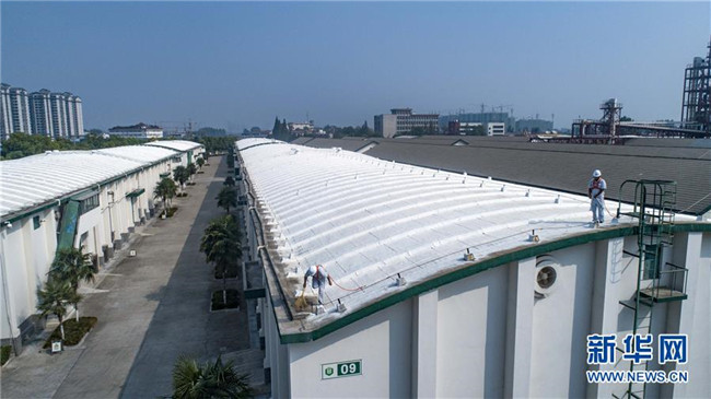 8月26日,中儲糧襄陽直屬庫兩名職工在檢查倉房屋面情況(無人機(jī)拍攝)。