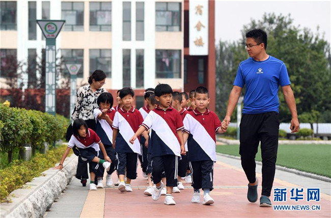 8月29日,體育老師宋陽(右)帶領(lǐng)一年級新生班同學前往體育館。 新華社記者 林宏 攝