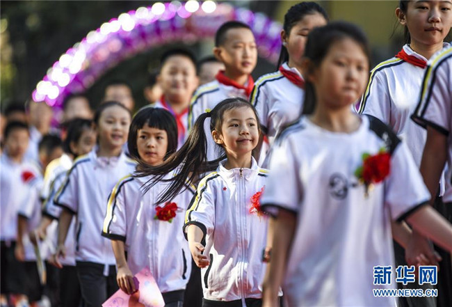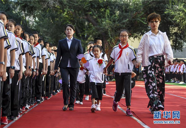 新學(xué)年伊始,新疆教育學(xué)院實(shí)驗(yàn)小學(xué)舉辦主題為“夢(mèng)想從這里啟航”的開學(xué)典禮,一年級(jí)新生在六年級(jí)學(xué)生的引領(lǐng)下培養(yǎng)愛學(xué)校、愛師長(zhǎng)、愛學(xué)習(xí)的品德,走進(jìn)校園開啟新生活。 新華社記者 王菲 攝