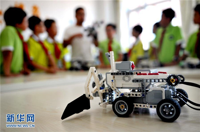 9月5日,在承德市雙橋區(qū)東園林小學,學生在老師的指導下學習機器人知識。